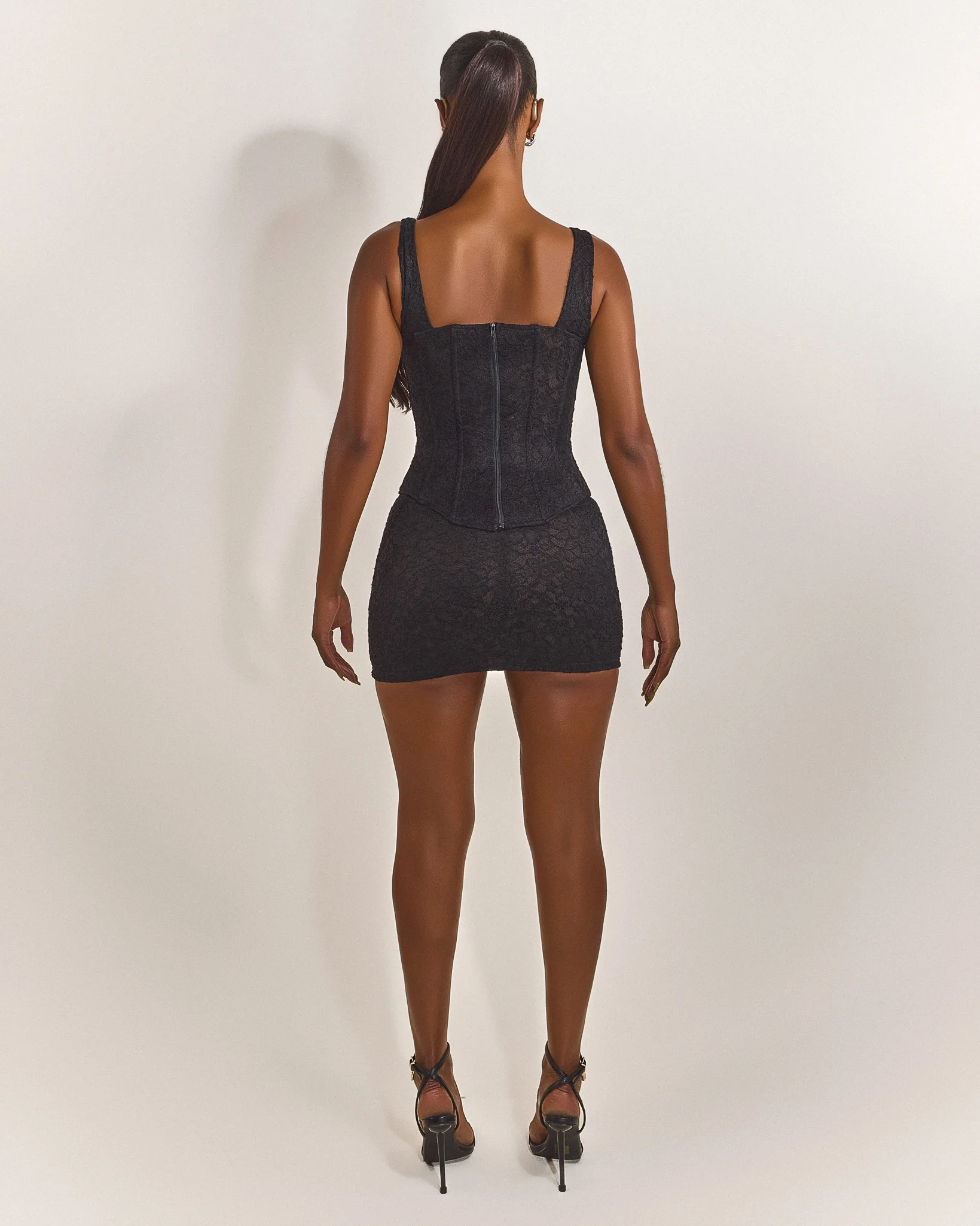 The cinched lace mini skirt in black.